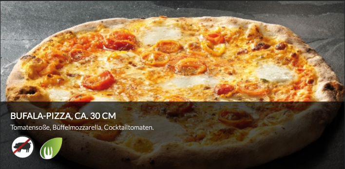 Belegt mit: Tomatensoße, Büffelmozzarella, Cocktailtomaten.